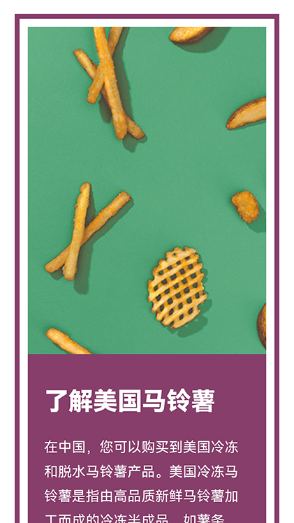 美国马铃薯协会(Potatoes USA)是为2500名美国商业马铃薯种植者提供帮助的非盈利推广组织,总部设立在美国科罗拉多州丹佛市。美国马铃薯协会(Potatoes USA)上海代表处致力于使更多人了解美国马铃薯的营养、多样性和丰富应用。多采为美国马铃薯协会(Potatoes USA)进入中国市场构建数字化品牌官网平台搭建及内容输出。