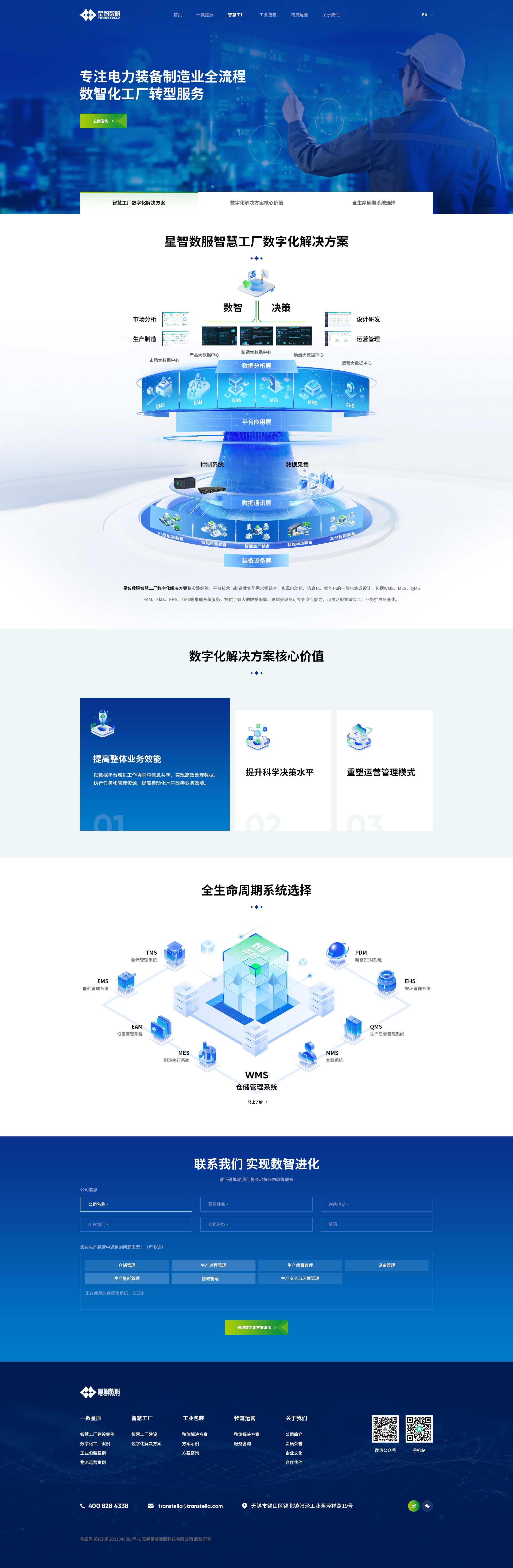 星智数服官网的重心是在制造业数字化转型领域树立“智慧工厂专业服务商”的品牌形象,打造“IE+IT深度融合”的数字能力窗口。通过三大业务的模块化展示、软件系统的可视化导览、解决方案场景的沉浸式呈现,优化用户体验,让用户感知全链路服务实力。设计上采用渐变光效、动态数据流线与模块化信息架构,重塑品牌的科技感与未来感,传递全链路智慧进化的驱动力。